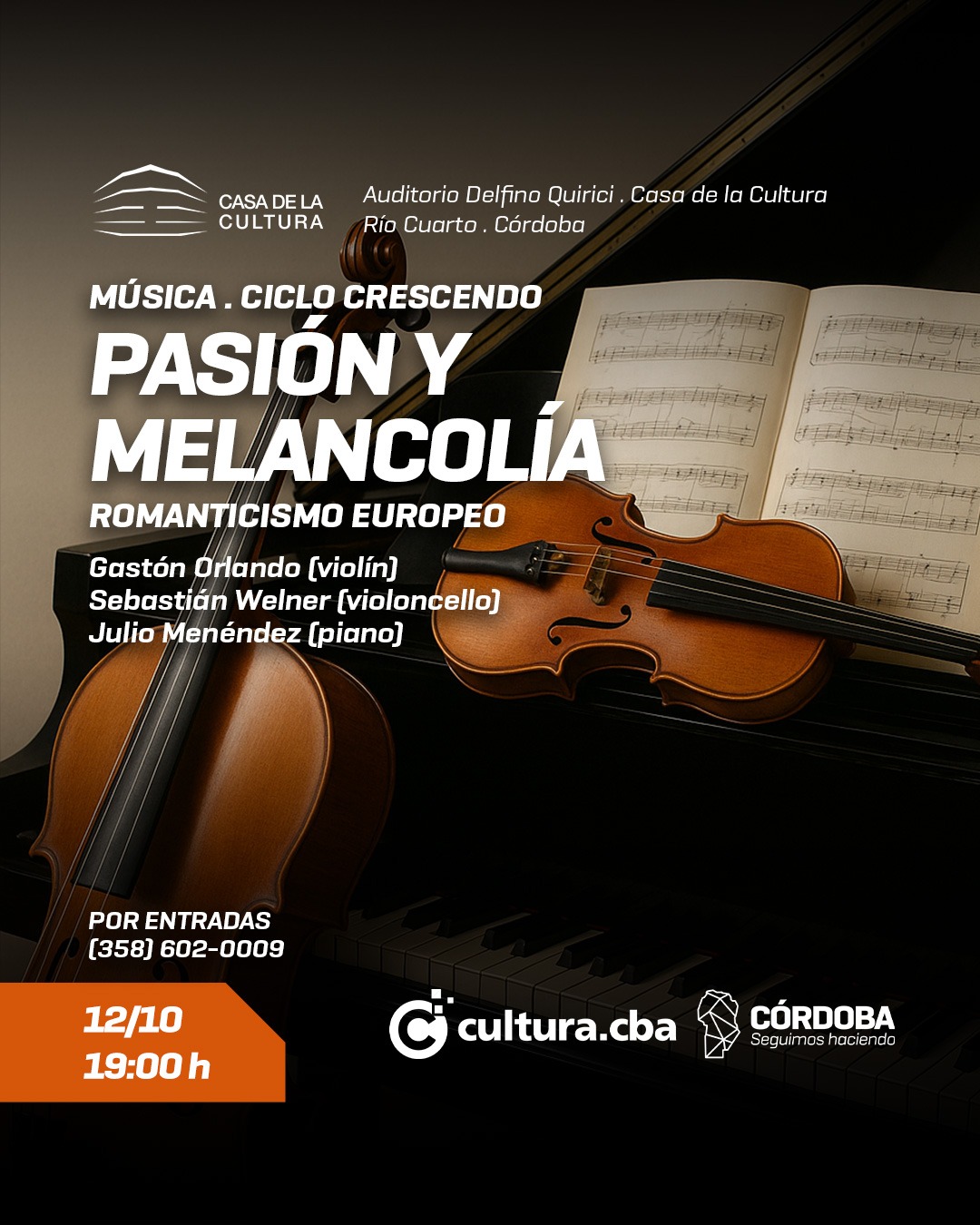 El próximo domingo 12 de octubre, el Auditorio Delfino Quirici (Rivadavia esquina General Paz – Casa de la Cultura, planta alta) será el marco de un destacado concierto de música de cámara. A las 19:00 horas, los músicos Gastón Orlando (violín)Sebastián Welner (violonchelo) y Julio Menéndez (piano) presentarán el recital titulado “Pasión y melancolía”, una propuesta que forma parte del Ciclo Crescendo.