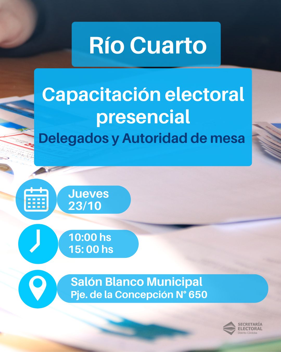 En el marco de las Elecciones Generales Legislativas del próximo domingo 26 de octubre, la Secretaría Electoral del Distrito Córdoba convoca a los ciudadanos designados como Autoridades de Mesa (Presidentes y Vocales) y Delegados de la Justicia Electoral a participar de la capacitación presencial que se realizará en la ciudad de Río Cuarto.