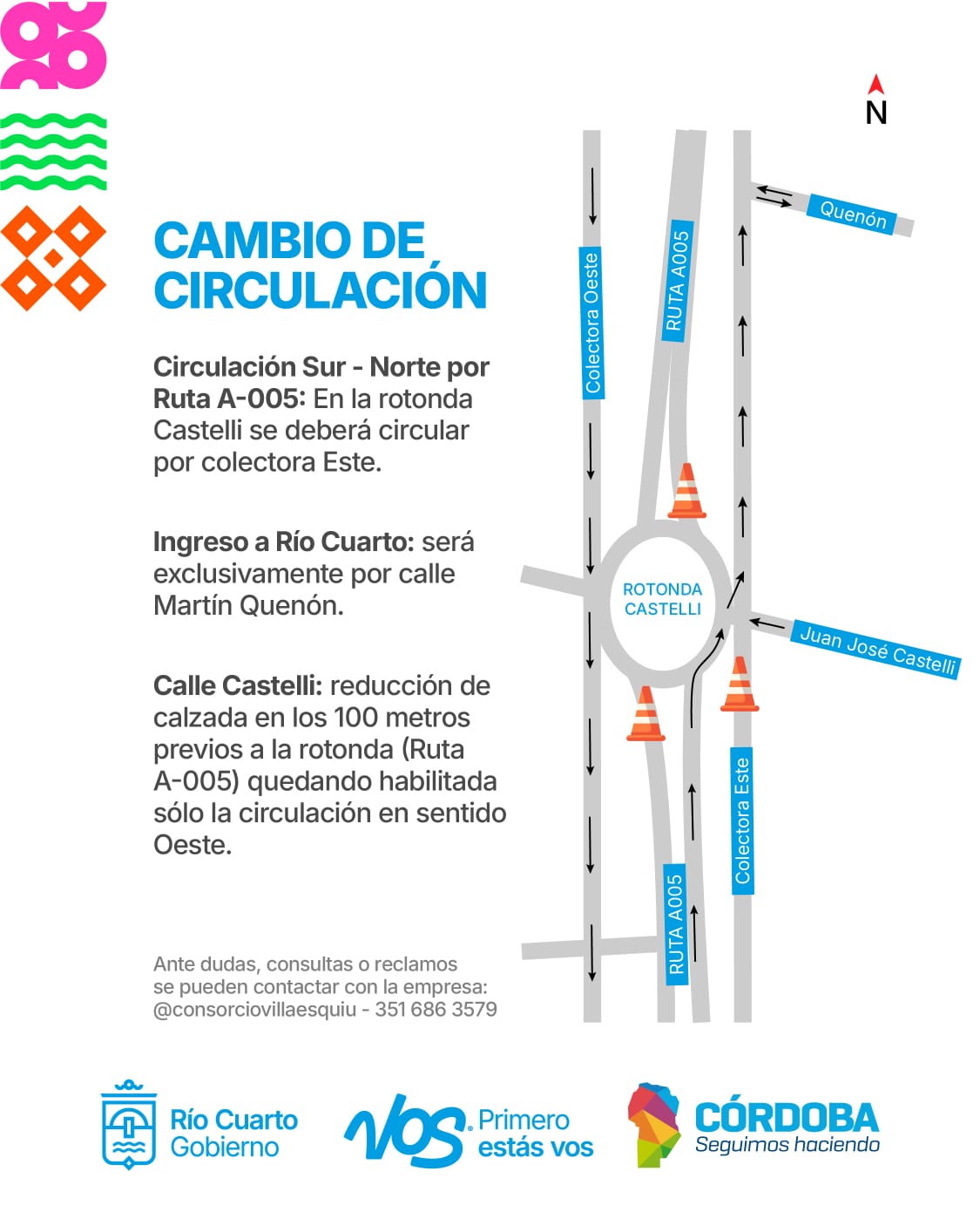 En primer término, se determinó que la circulación en sentido sur – norte por ruta A-005 deberá realizarse por la colectora este en la zona de la rotonda Castelli. Asimismo, el ingreso a la ciudad de Río Cuarto se realizará exclusivamente por calle Martín Quenon.
