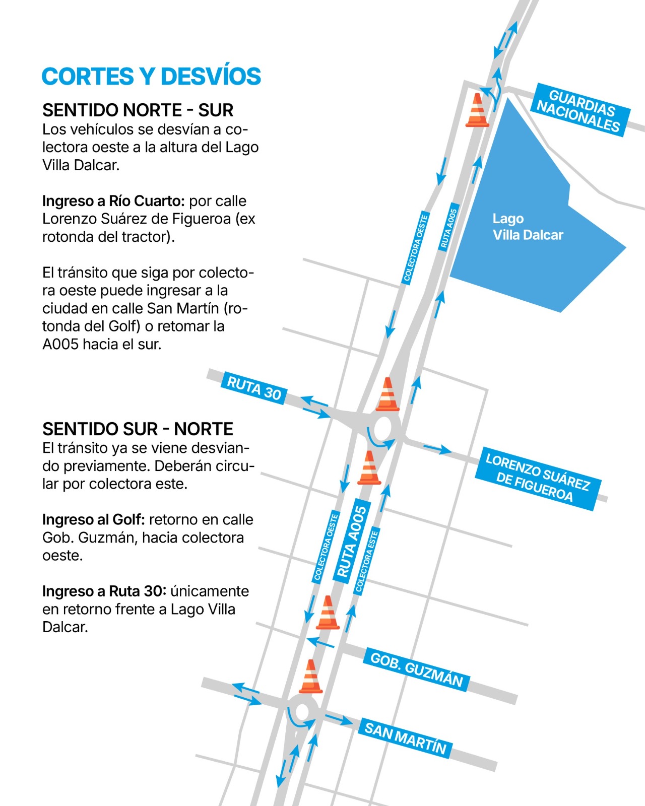Asimismo, el tránsito que continúa por colectora podrá ingresar nuevamente a Río Cuarto en la calle San Martín (ex rotonda del Golf), donde se podrá girar a la izquierda para acceder al centro o retomar la ruta A005, en caso de que continúen hacia el sur.