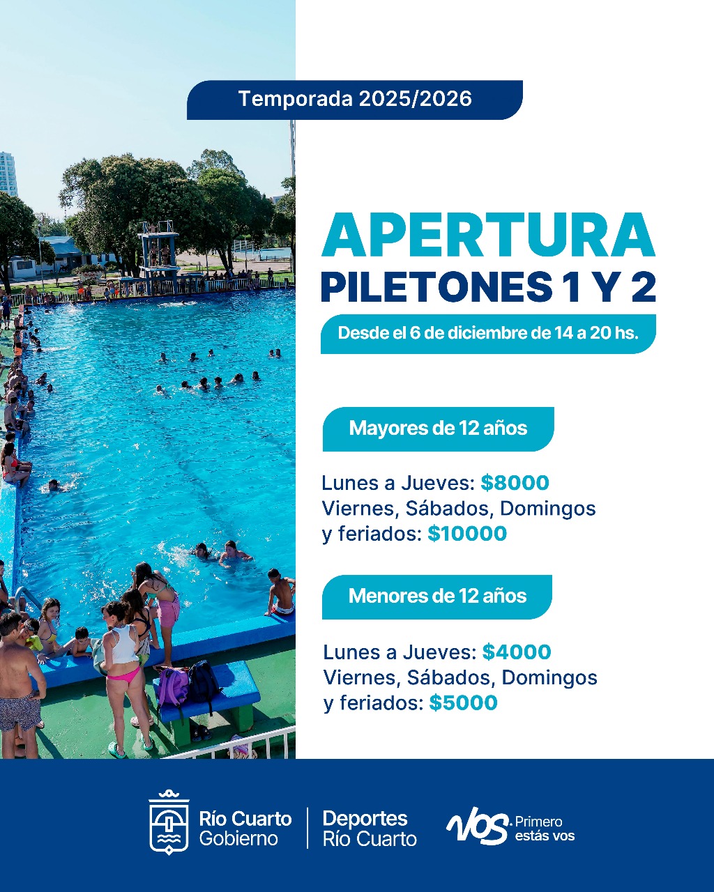 Desde este sábado 6 de diciembre, los vecinos de Río Cuarto y la región podrán comenzar a disfrutar de los Piletones Municipales, que quedarán oficialmente habilitados para toda la temporada estival 2025-2026. Las instalaciones estarán abiertas al público todos los días de 14:00 a 20:00 horas.