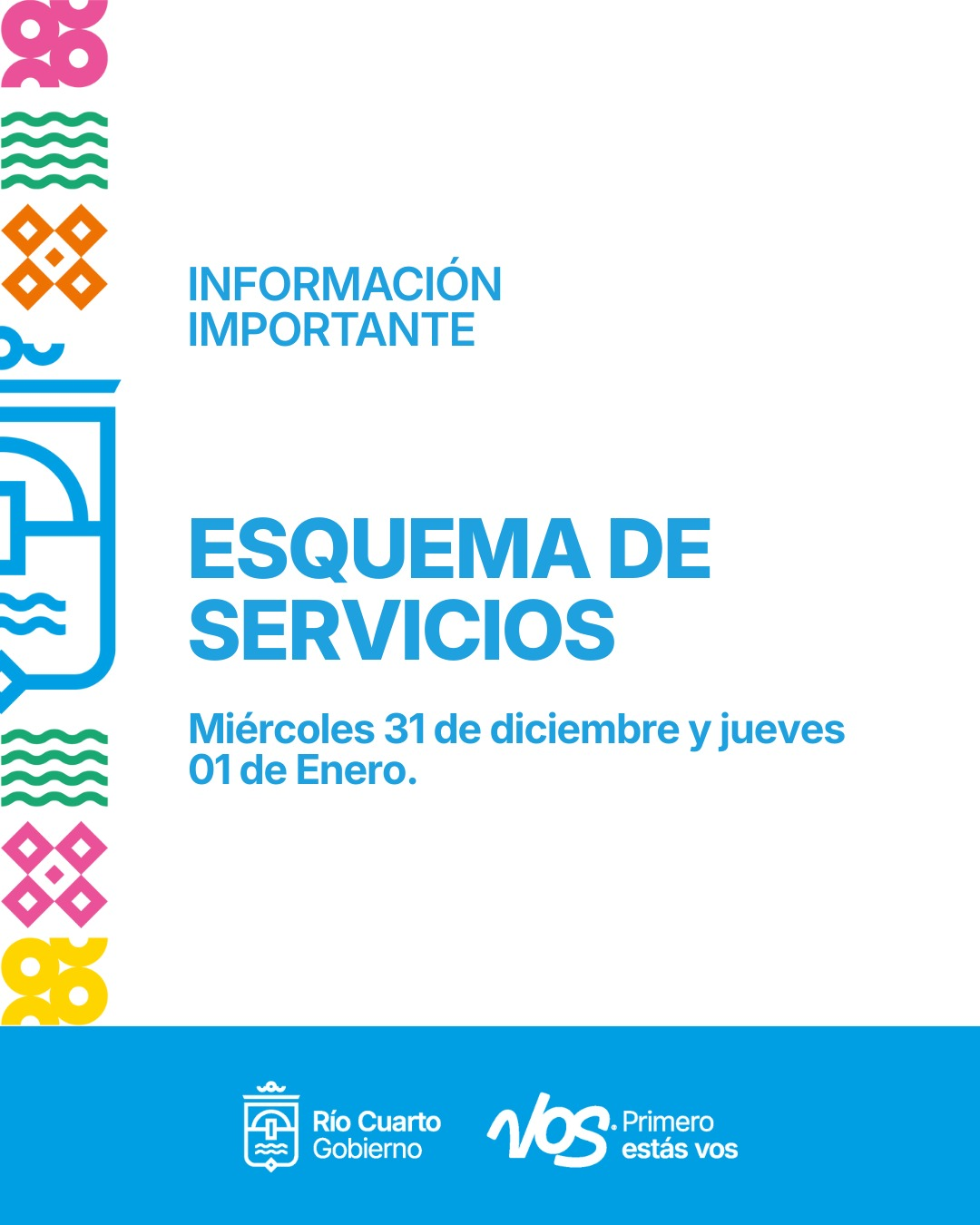 Estacionamiento medido: Miércoles 31: Cobro de estacionamiento y atención en oficinas, hasta las 13:00hs – Jueves 1: Sin cobro de estacionamiento y cerrado el local de atención al público.