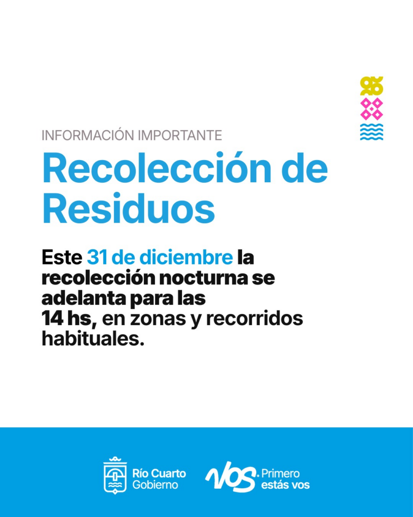 El Gobierno de Río Cuarto informa a la comunidad que, con motivo de las celebraciones de fin de año, se producirán modificaciones en el servicio de recolección de residuos.