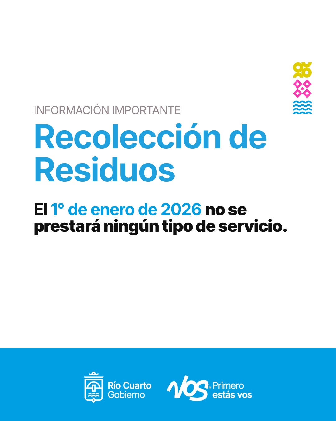El Gobierno de Río Cuarto informa a la comunidad que, con motivo de las celebraciones de fin de año, se producirán modificaciones en el servicio de recolección de residuos.