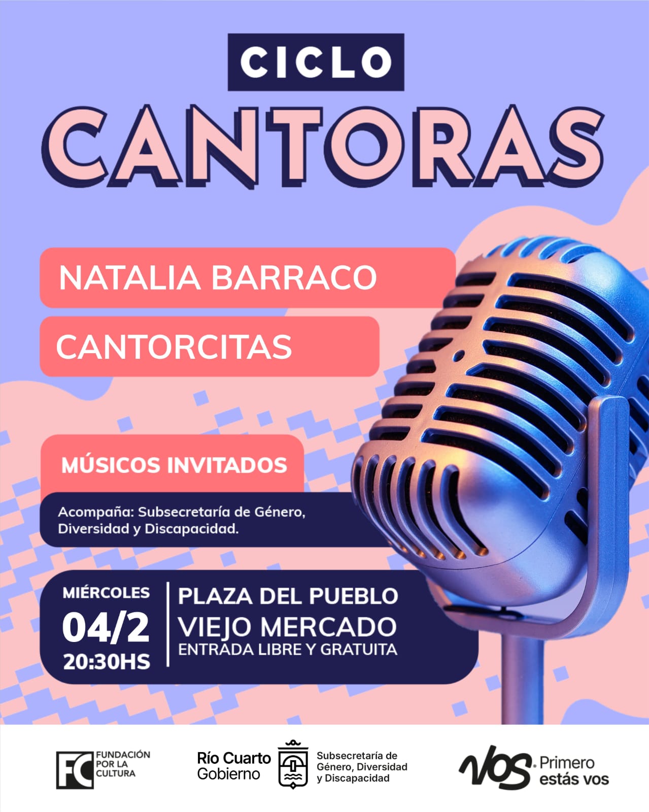 La agenda comienza el dia de hoy con el Ciclo Cantoras , que contará con las voces de Natalia Barraco y “Cantorcitas”, y el acompañamiento de músicos invitados. El evento se desarrollará en la Plaza del Pueblo a las 20:30 hs y no se suspenderá por lluvia. La entrada es libre y gratuita