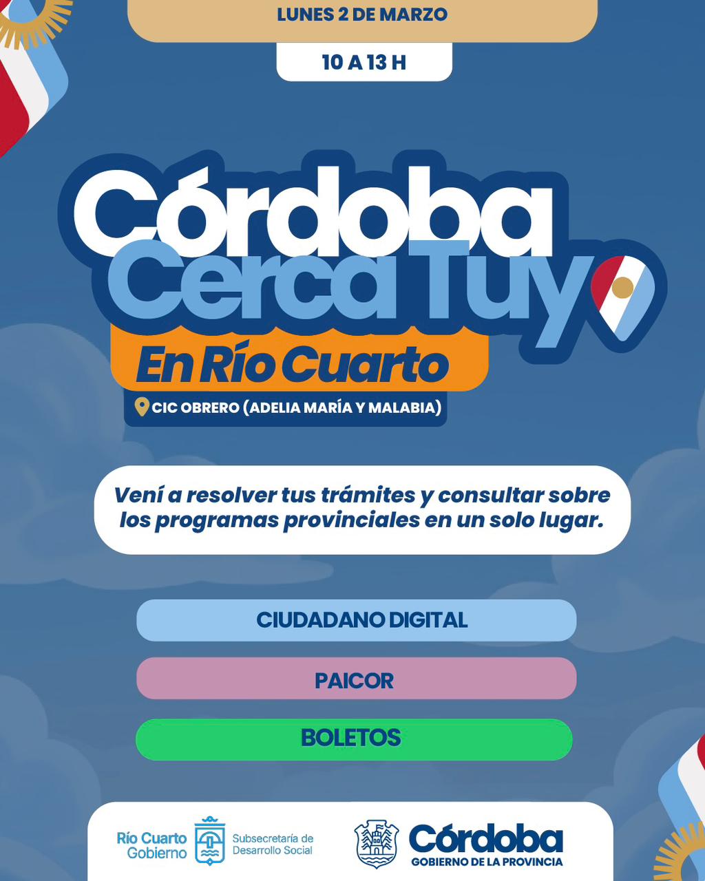 Lunes 2 de marzo – 10 a 13 horas – CIC OBRERO (calle Adelia María y José Malavia)