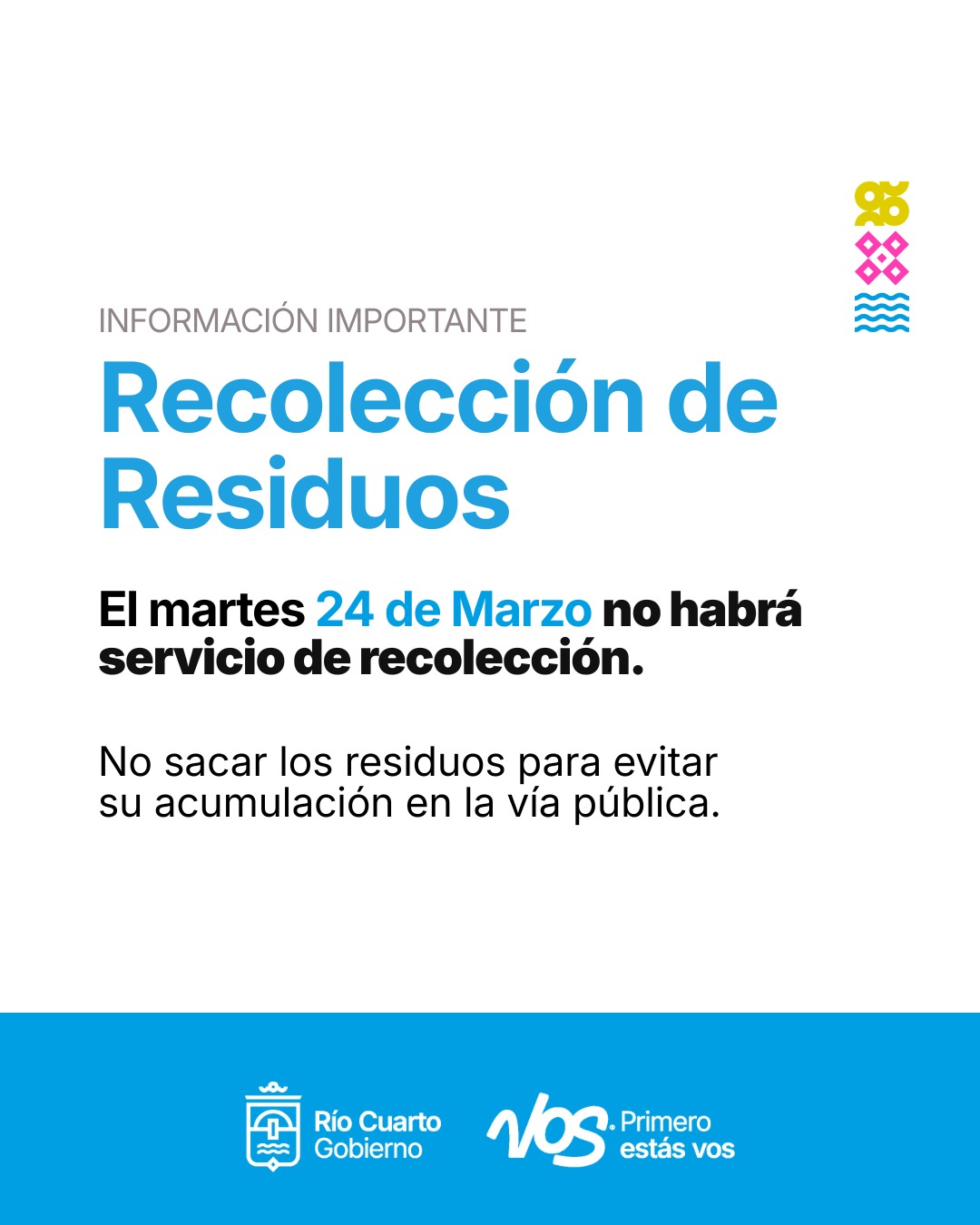 * Recolección de residuos: Lunes 23: Servicio Normal, Martes 24: No habrá recolección.