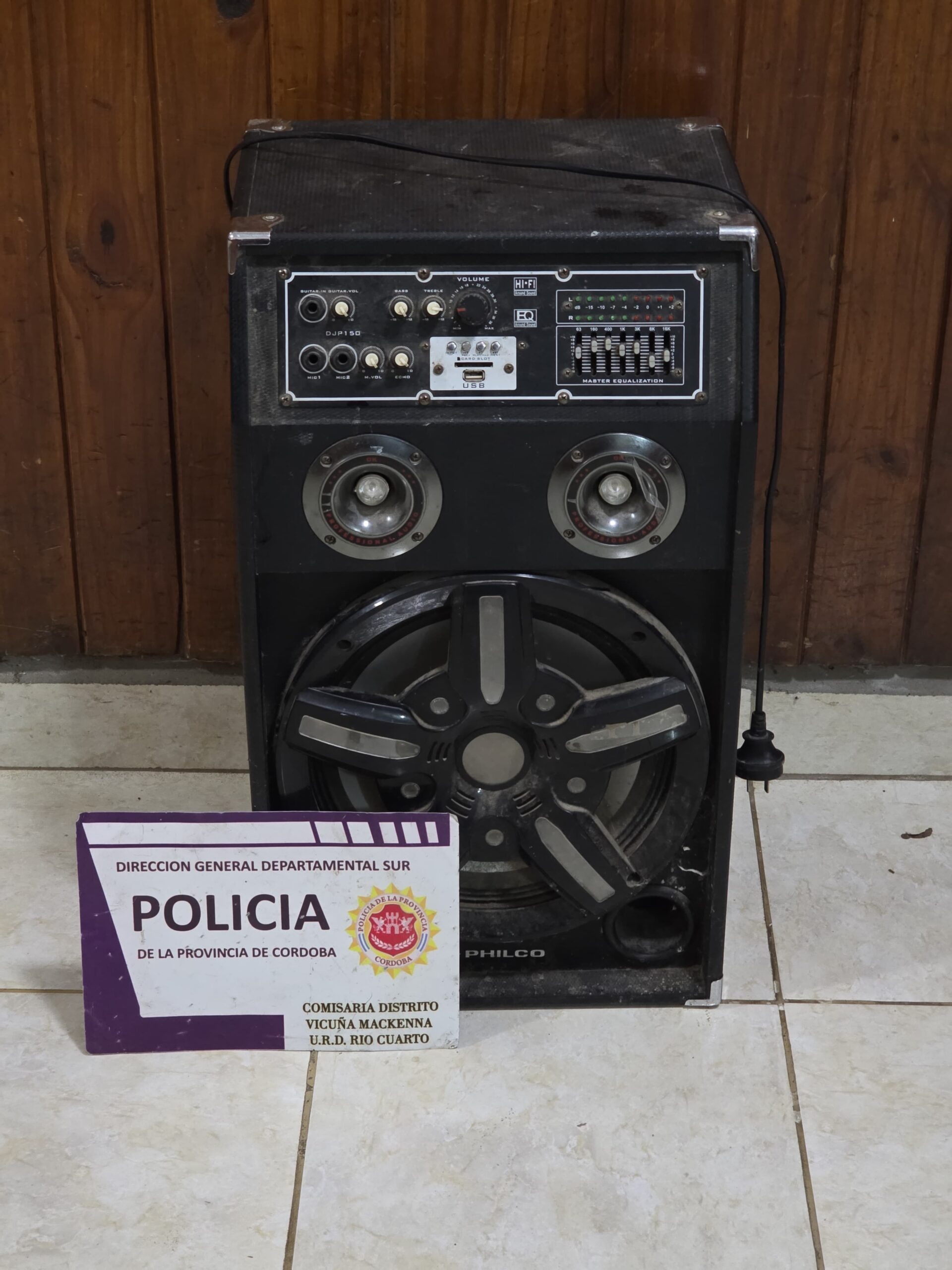 En la ciudad de Vicuña Mackenna, se procedió a la detención de un hombre de 31 años en la esquina de Alberto Novillo y Julio A. Roca, quien al momento del control transportaba un parlante cuya procedencia no pudo justificar. Posteriormente, se estableció que el elemento había sido sustraído recientemente a un vecino de la localidad. Se iniciaron las actuaciones judiciales bajo las directivas del Ministerio Público Fiscal.
