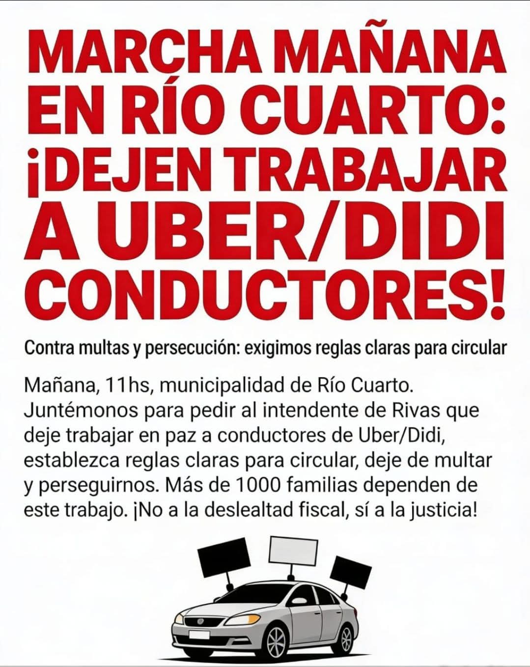 Trabajadores de plataformas de transporte realizarán una movilización este jueves a las 11 horas por las calles céntricas de Río Cuarto.